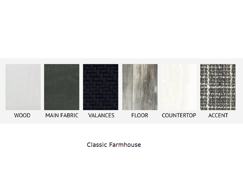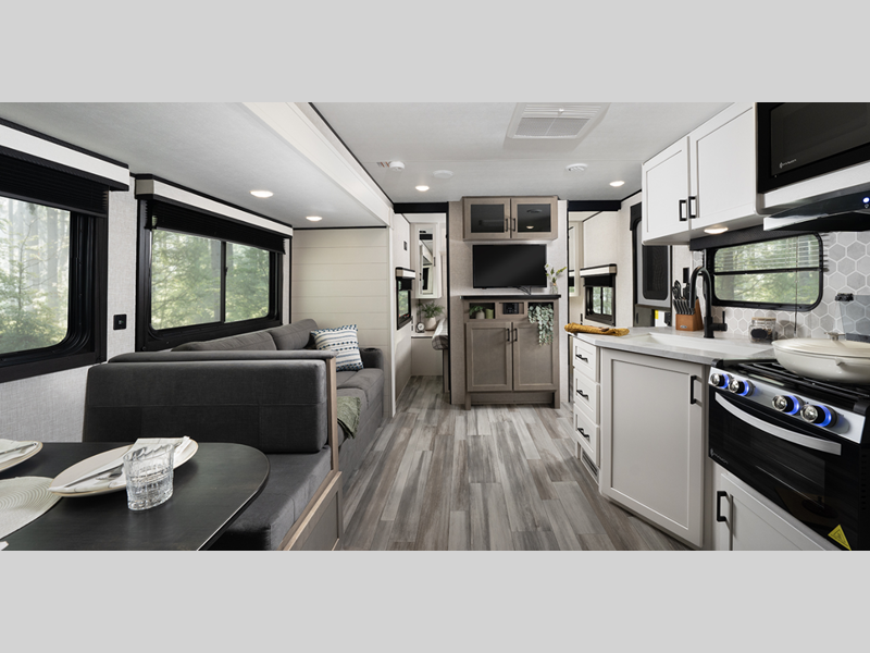 Sleeps 4 Slides 1 Length 31 ft 1 in Ext Width 8 ft Ext Height 11 ft 2 in Int Height 6 ft 9 in Interior Color Classic Farmhouse Hitch Weight 790 lbs GVWR 7850 lbs Dry Weight 6205 lbs Cargo Capacity 1645 lbs Fresh Water Capacity 76 gals Grey Water Capacity 39 gals Black Water Capacity 39 gals Tire Size ST225/75R15'E' Furnace BTU 30000 btu Available Beds RV Queen Refrigerator Type 12V Refrigerator Size 11 cu ft Cooktop Burners 3 Number of Awnings 1 LP Tank Capacity 20 lbs Water Heater Type Tankless AC BTU 13500 btu Awning Info 18' Power with LED Lights Axle Count 2 Number of LP Tanks 2 Shower Type Radius Electrical Service 30 amp Similar Floorplans