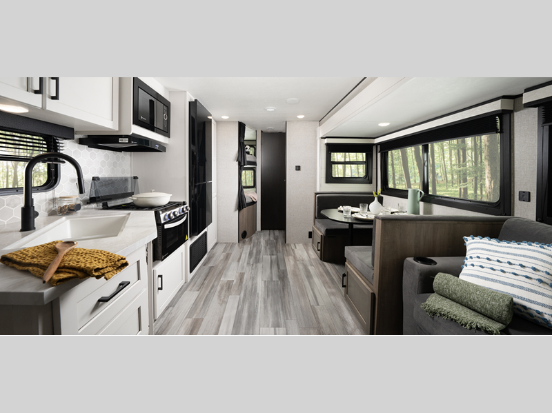 Sleeps 8 Slides 1 Length 30 ft 4 in Ext Width 8 ft Ext Height 11 ft Int Height 6 ft 9 in Interior Color Classic Farmhouse Hitch Weight 790 lbs GVWR 7600 lbs Dry Weight 5905 lbs Cargo Capacity 1695 lbs Fresh Water Capacity 76 gals Grey Water Capacity 39 gals Black Water Capacity 39 gals Tire Size ST205/75R14D Furnace BTU 20000 btu Number Of Bunks 2 Available Beds RV Queen Refrigerator Type 12V Refrigerator Size 11 cu ft Cooktop Burners 3 Number of Awnings 1 LP Tank Capacity 20 lbs Water Heater Type Tankless AC BTU 13500 btu Awning Info 16' Power with LED Lights Axle Count 2 Number of LP Tanks 2 Shower Type Tub/Shower Combo Electrical Service 30 amp Similar Floorplans