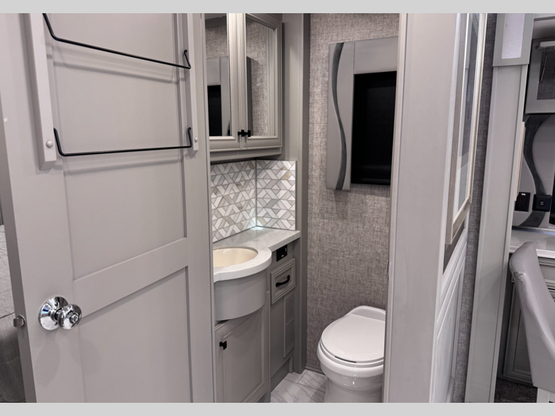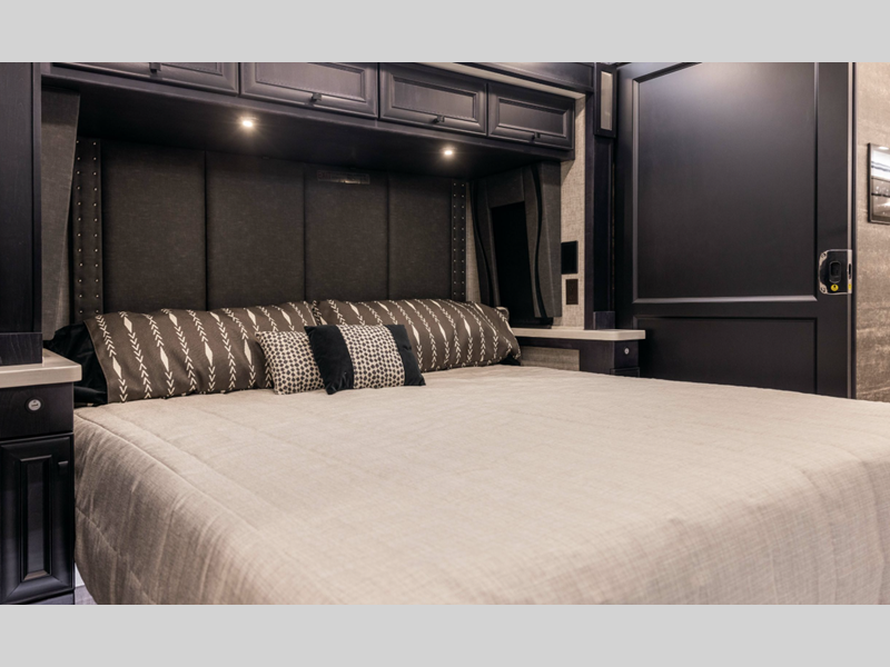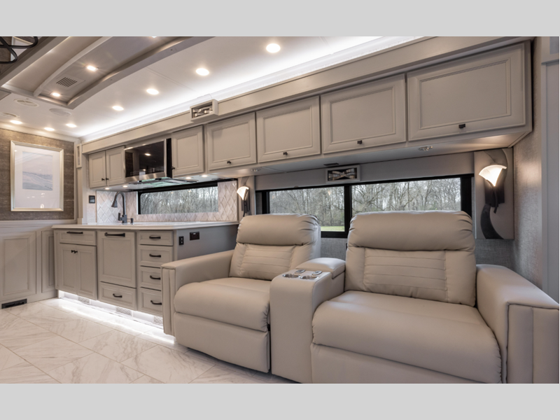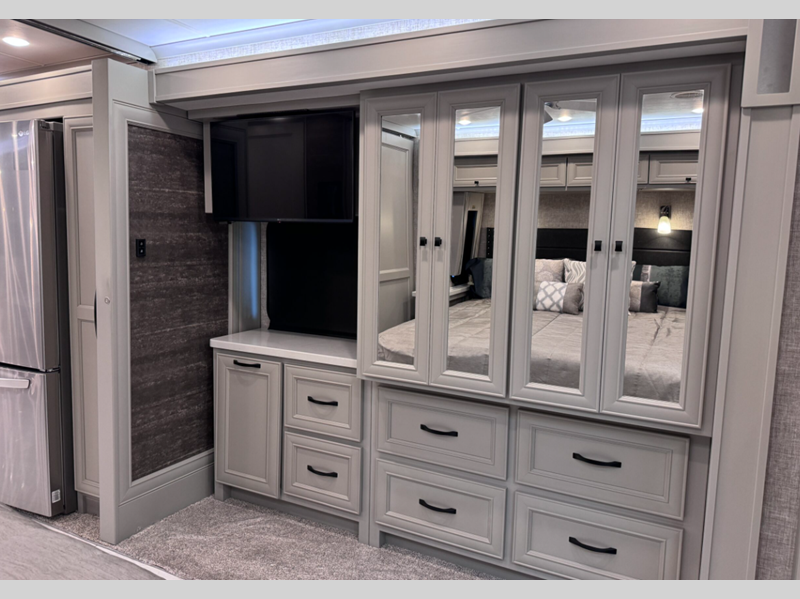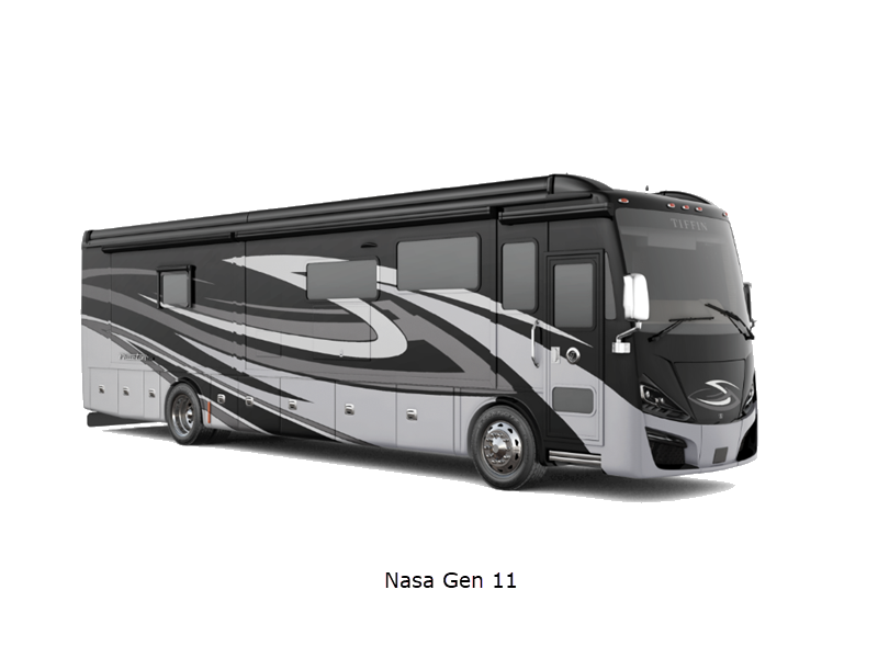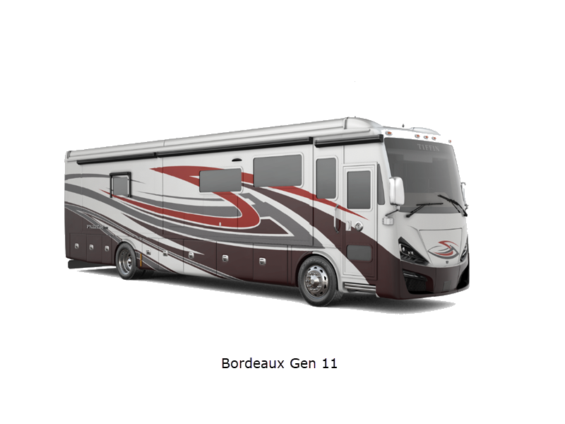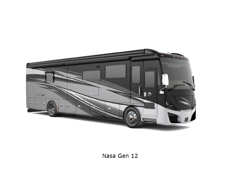 Sleeps 7 Slides 4 Length 41 ft 4 in Ext Width 8 ft 5 in Ext Height 13 ft 3 in Int Height 6 ft 11 in Interior Color Gelato, Mesa, Titanium Exterior Color Gen 10, Gen 11; Bordeaux, Waterfall, Frosted Granite, Nasa, White Mahogany. Midnight Blue Edition Hitch Weight 10000 lbs GVWR 40000 lbs Fresh Water Capacity 100 gals Grey Water Capacity 100 gals Black Water Capacity 55 gals Tire Size 295/80R22.5 Furnace BTU 60000 btu Generator 10.0kW Onan Quiet Diesel Fuel Type Diesel Engine Cummins L9 Chassis Freightliner PowerGlide XC Raised Rail Rear Horsepower 450 hp Fuel Capacity 100 gals Wheelbase 266 in Available Beds King Torque 1250 ft-lb Refrigerator Type Stainless Steel Residential with French Doors and Bottom Freezer Refrigerator Size 25 cu ft Convection Cooking Yes Cooktop Burners 2 Shower Size 31.75" x 40" Number of Awnings 2 Axle Weight Front 16000 lbs Axle Weight Rear 24000 lbs LP Tank Capacity 35.7 gals AC BTU 45000 btu Basement Storage 232 cu. ft. TV Info LR TV, BR Mounted TV, Ext. TV Awning Info Girard Power Patio and Window Washer/Dryer Available Yes Gross Combined Weight 50000 lbs Shower Type Shower w/Seat Electrical Service 50 amp Similar Floorplans